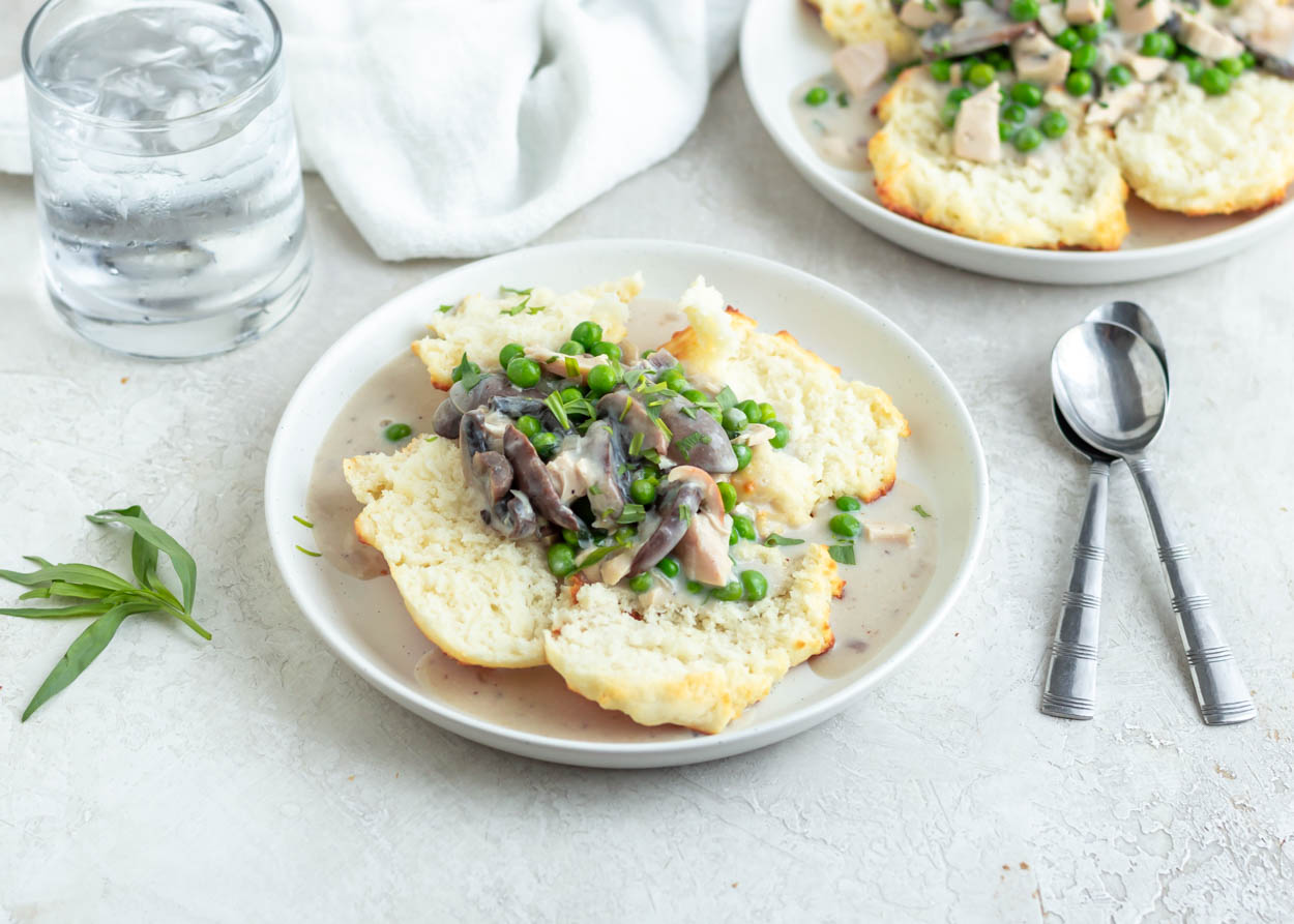 This comforting take on chicken pot pie comes together quickly on the stovetop. Ladling the rich gravy over freshly baked biscuits makes this dish extra homey. Smarts: We love the savory flavor of mushrooms in this dish, but if they aren't for you, feel free to sub another vegetable such as carrots or spinach.