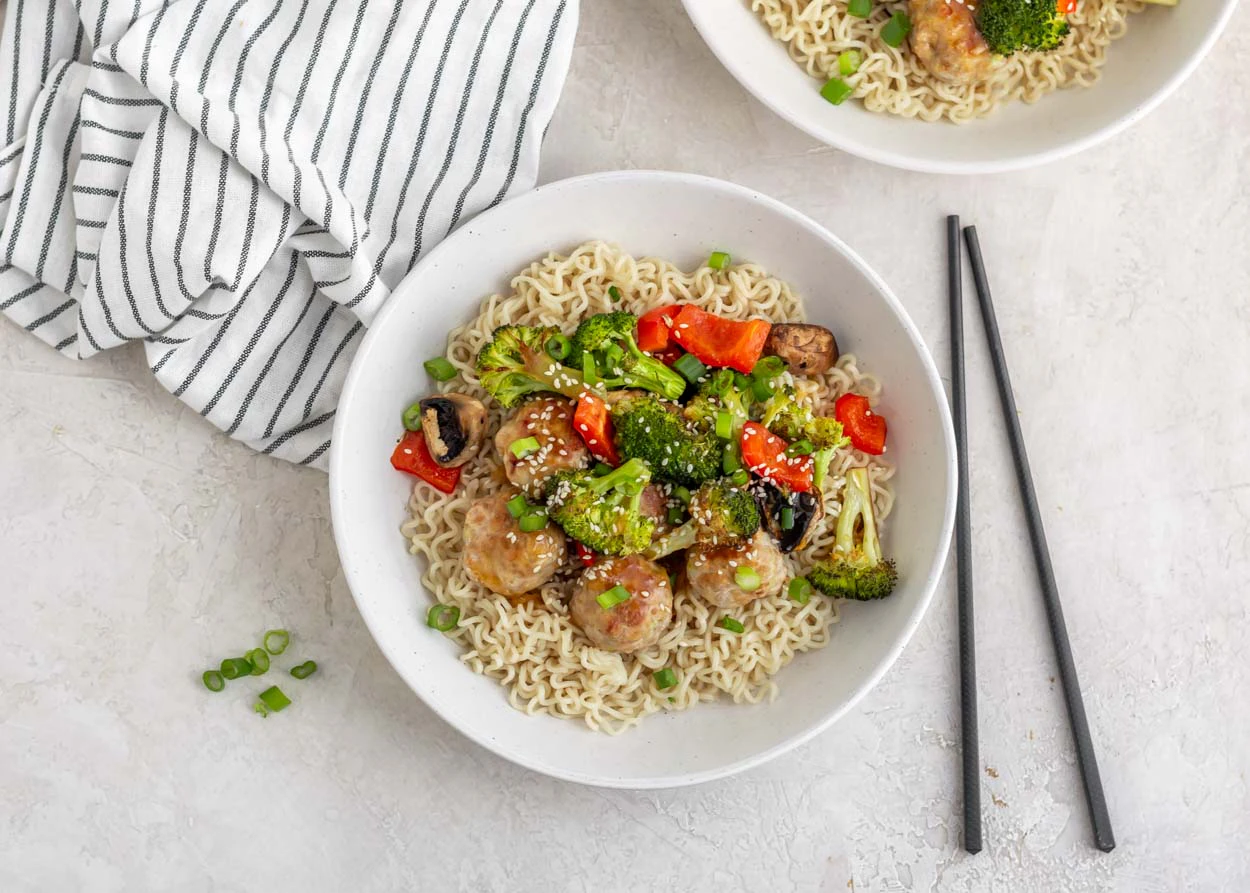 Divide ramen noodles among serving bowls. Top noodles with meatballs and roasted vegetables and drizzle teriyaki sauce over top. Sprinkle with green parts of green onions and sesame seeds. Enjoy!